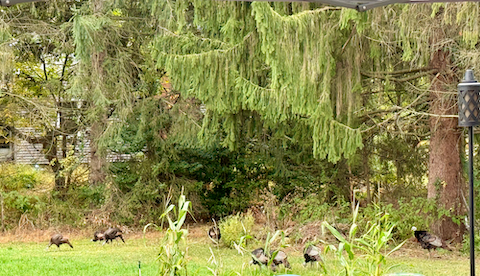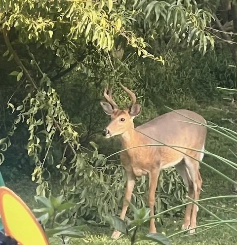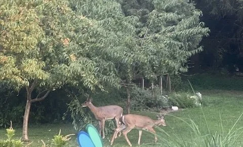 Although they live in the city limits, Becki and Byron have deer visiting their back yard. The deer like the fruit on their peach trees.