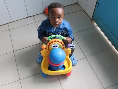 In her second suitcase, Michelle brought clothes, a riding vehicle, and a push vehicle. The best gift was coloring books. Thank you, Carol and Michelle.