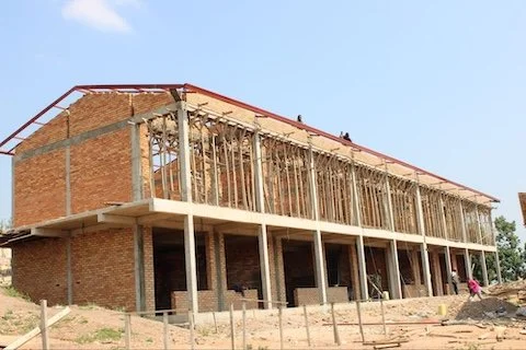 Moving into a new age. I am amazed at the advancement in construction in the Muhanga District. So much of the grunt labor is now being done by machines. First, a cement mixer, then safer scaffolding, and now a shovel for moving loose earth and leveling.